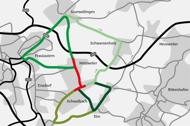 - Bauphase 12 (Einmündung „Elmer Straße“ bis L 139 „Hauptstraße“, Höhe Haus-Nr. 243): Umleitung großräumig über Bous und Knausholz – über L 139, L 344, L 140, L 341.