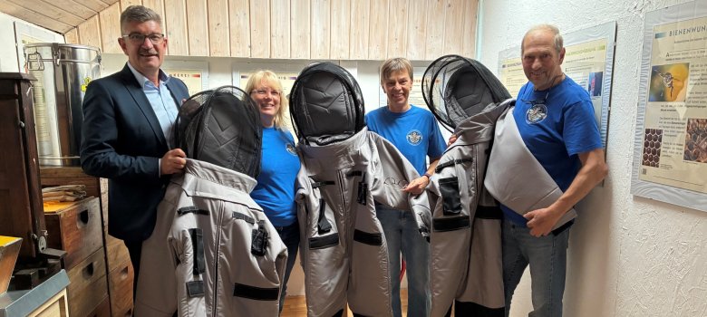 v.l.n.r.: Bürgermeister Markus Weber mit Claudia Hennen, Theda Wolfering und Günter Noh (MitgliederInnen des Bienenzuchtverein Schwalbach) bei der Übergabe der Anzüge